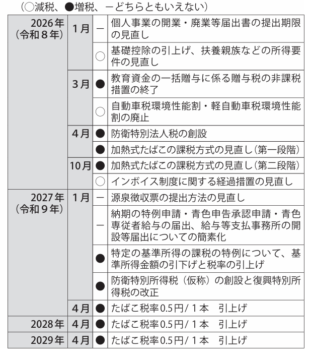 自民党と日本維新の会が昨年12月に公表した令和8年度与党税制改正大綱では、投資促進税制やインボイス制度の見直し、基礎控除などの見直しが盛り込まれました。