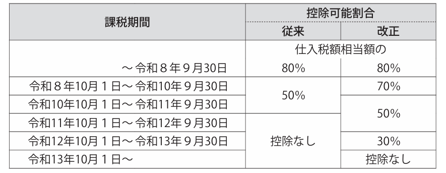 経過措置は段階的に縮小されます。最終的には免税事業者からの仕入れに対する控除は認められなくなります。